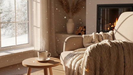 A warm and inviting living room scene unfolds, bathed in soft natural light streaming through a window. Outside, gentle snowflakes fall, creating a serene winter landscape. In the foreground, a steaming cup of coffee rests on a small wooden table next to a plush armchair draped with a thick, knitted blanket. A fireplace with glowing embers and flickering flames is visible in the background, enhancing the cozy and comforting atmosphere. evokes feelings of hygge, relaxation, and peaceful...