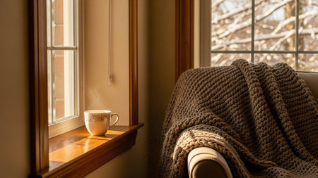 A warm and inviting scene depicting a cozy winter morning. A white ceramic mug, emitting gentle steam, sits on a wooden windowsill bathed in soft sunlight. Beside it, a plush, knitted brown blanket is draped over a chair, suggesting comfort and warmth. The view through the window reveals a softly blurred winter landscape, enhancing the feeling of peaceful seclusion and domestic tranquility.
