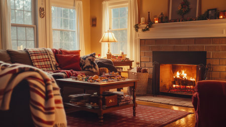 A family gathers in a welcoming living room for game night, enjoying soft blankets, tasty snacks, and the warmth of a crackling fireplace.