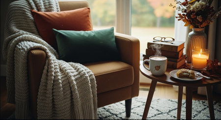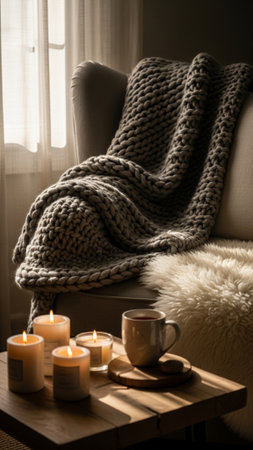 A cozy living room scene featuring a comfortable armchair draped with a knitted blanket, surrounded by decorative elements like candles, books, and plants, creating a warm and inviting atmosphere