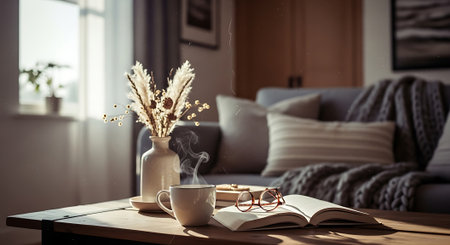 A serene living room setting with a steaming coffee cup, book, and glasses on a wooden table, accompanied by a vase with dried flowers and a comfortable couch in the background.