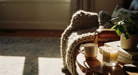A serene living room scene featuring a beige couch with a knitted blanket, a wooden side table with a stack of books, a steaming white coffee cup, and a potted plant, bathed in warm sunlight.