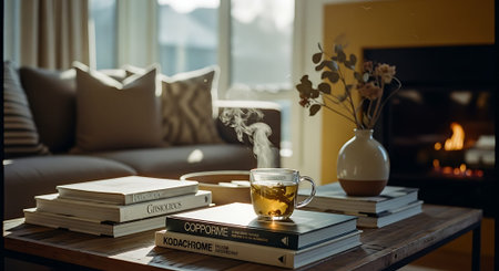 A warm living room scene with a stack of books, a cup of tea, and a vase of dried flowers on a wooden coffee table near a lit fireplace.