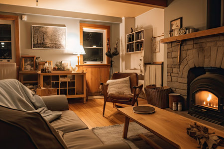 warm and cozy home, with crackling fireplace, warm lighting, and wooden accents, created with generative ai
