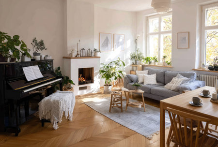This living room features a piano, plants, and a fireplace, creating a warm, inviting atmosphere. The space includes a sofa, wooden table, and natural light streaming through the windows. This composition could be useful for interior design or lifestyle-related editorial content, showcasing domestic settings.
