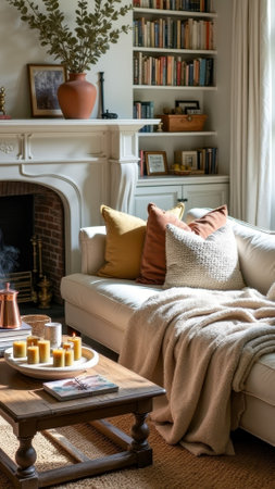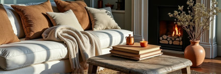 Cozy living room with neutral sofa, throw pillows, wooden coffee table, candles, and fireplace. That the image is generated using AI.