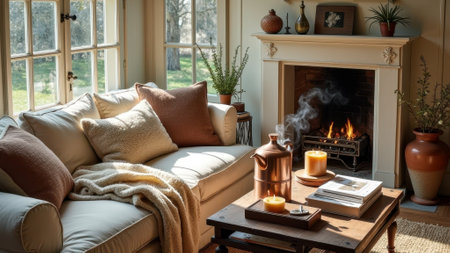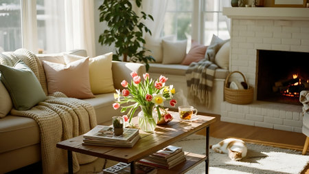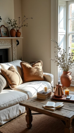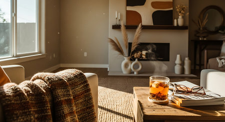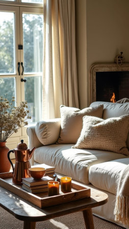 A serene living room scene featuring a beige couch with throw pillows, a wooden coffee table with a steaming cup of tea, books, and a vase with flowers, bathed in natural sunlight.