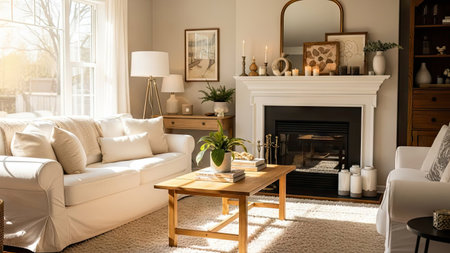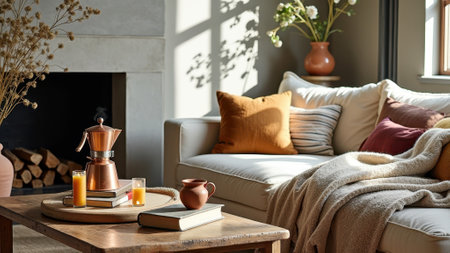 Cozy sunlit living room with neutral decor and warm accents. That the image is generated using AI.