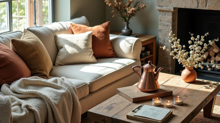 A serene living room with a beige sofa, adorned with colorful pillows and a throw blanket, accompanied by a wooden coffee table with a candle, books, and a plant, bathed in warm sunlight.