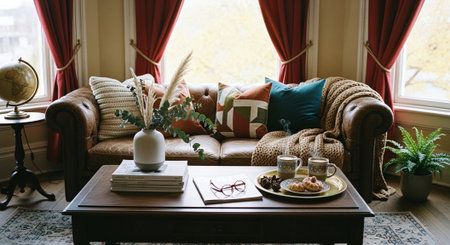 A beautifully designed living room exuding warmth and comfort, featuring soft throws, decorative pillows, and lush indoor plants, perfect for relaxation.