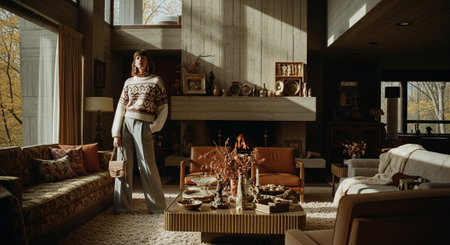A cozy living room with large windows showing a snowy landscape outside, a woman sitting on a sofa with a cup in hand, warm lighting, and decorative plants