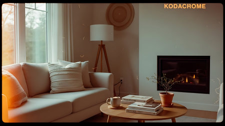 Cozy living room with sofa, fireplace, and wooden coffee table in warm light. That the image is generated using AI.
