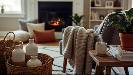 Cozy living room with fireplace, coffee cup and wicker basket