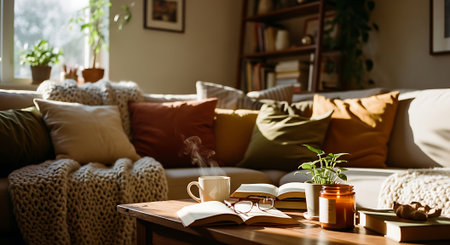 A cozy living room with a cup of coffee and a good book