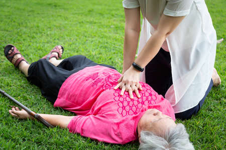 Asian daughter first aid emergency CPR on unconscious senior mother,female caregiver try to resuscitation patient,after accident,heart attack,shock,elderly woman with cardiac arrest while exercise in park