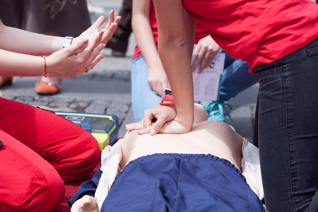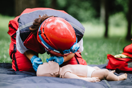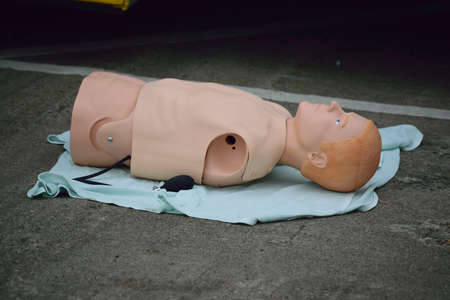 Cpr training outdoors. Reanimation procedure on CPR doll