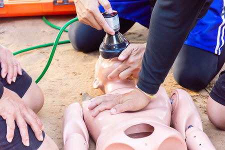 hand student Heart pump with medical dummy on CPR, in emergency refresher training to assist of physician