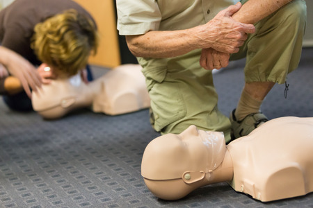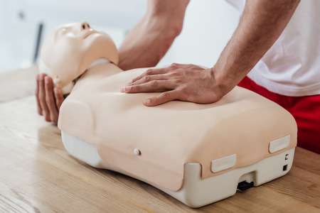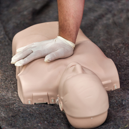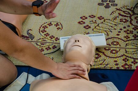 CPR aid dummy medical training with hand press Heart on doll emergency refresher training Concept closed-up.