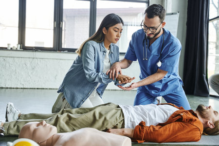 medical instructor showing hands position for cardiopulmonary resuscitation to young asian woman near man lying next to CPR manikin in training room, effective life-saving skills and techniques concept