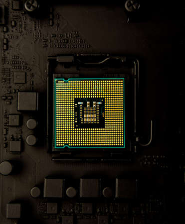 Close up of CPU Processor over Computer Motherboard. Tecnology background.