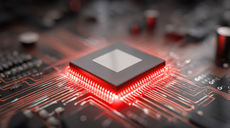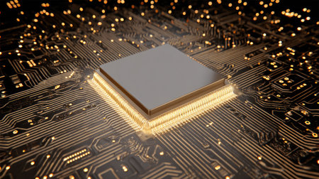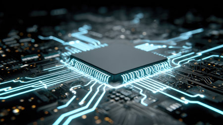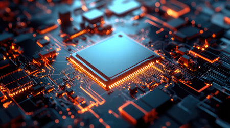 A detailed scene featuring a futuristic microprocessor positioned on a circuit board, highlighted by glowing connections that symbolize advanced technology and innovation.