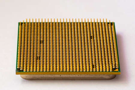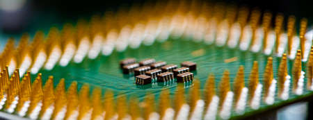Processor to the computer. Concept for technology and computing. Detail of connectors. CPU Chip Processor for tech science background.