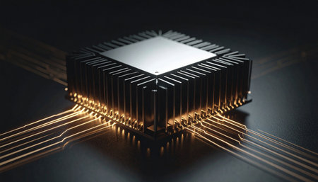 Detailed closeup of a metallic AI processor heat sink with glowing circuit lines extending outward, symbolizing computational energy, studio lighting, no humans, no text.