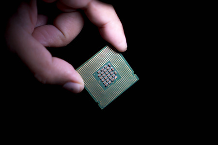 Fingers holding cpu microchip on black background. Micro photography, top view.