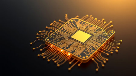 AI Generated. Golden Circuit Board with Glowing Lines and Microchip