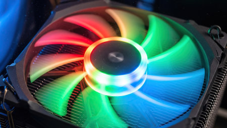 Inside a high-performance machine, a powerful cooling fan spins silently, its blades illuminated by a vibrant, shifting spectrum of neon light.