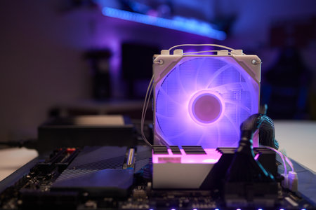 Close-up of illuminated CPU cooling fans on a high-tech computer. Concept Technology, Computer Hardware, PC Components, Illuminated Fans, Close-up Shot