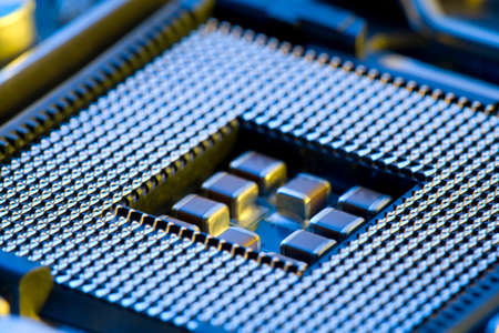 Macro Close up of microchips and pins on Main CPU PC processor circuit board.