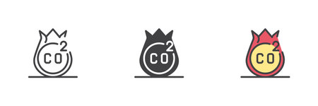 CO2 emission icon set in line, solid, and filled outline vector style. Depicts carbon dioxide environmental symbol related to oil, fuel and gas combustion impact.