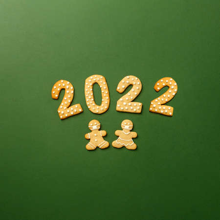 Happy New Year's set of cookies, gingerbread man and woman in face mask, number 2022 biscuits glazed sugar decoration on green background.