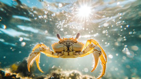 A vibrant crab swims gracefully through sunlit waters, surrounded by bubbles and bright reflections, showcasing the beauty of underwater marine life and ecosystems.