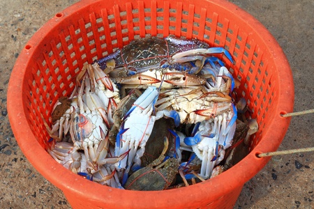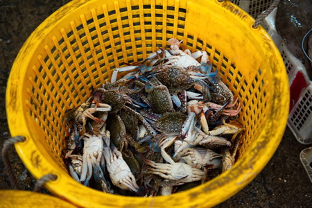 Alive Fresh Crab in the Plastic Basket in the Fisherman Village Market.