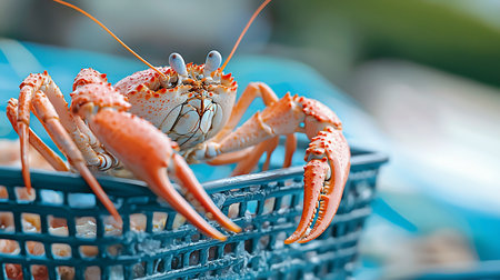 A vibrant bucket filled with freshly caught crabs, showcasing the dynamic seafood harvest in a coastal marketplace. Perfect for culinary and marine themes.