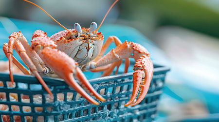 A detailed close-up showcases a vibrant orange crab with prominent claws, nestled in a blue plastic basket, likely caught and prepared for culinary use.