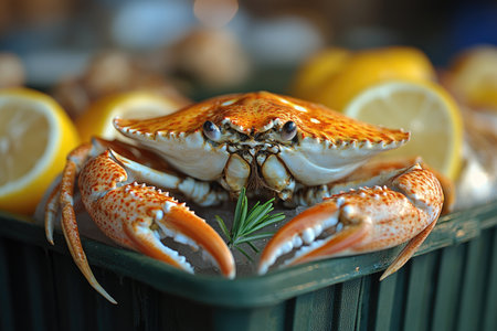 Close-up of a Cooked Crab with Lemon Wedges in a Green Container