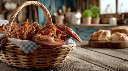 A beautifully arranged basket of freshly caught crabs sits on a rustic wooden table, complemented by home-baked bread, evoking a cozy kitchen atmosphere perfect for culinary inspiration.