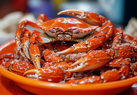 A close-up of delicious cooked crabs in a spicy sauce, presented as a mouth-watering seafood dish. This gourmet meal is a highlight of Asian cuisine, featuring fresh seafood prepared to perfection.