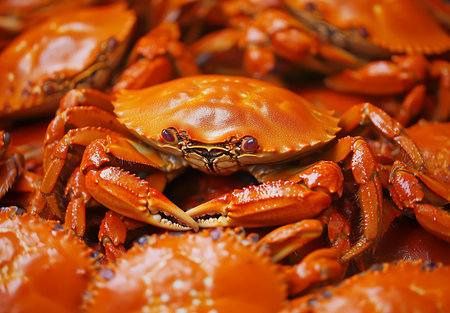A close-up of vibrant fresh crabs displayed at a seafood market, perfect for Asian cuisine. The crabs are bright orange with detailed textures, showcasing their freshness and readiness for culinary preparation.