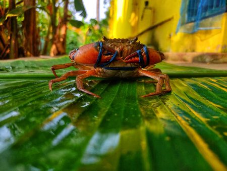 different angle view of mud crab scylla serrata on green leaf