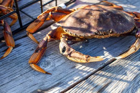 alive crab standing on wooden floor. outdoor shot in norway. copy space.