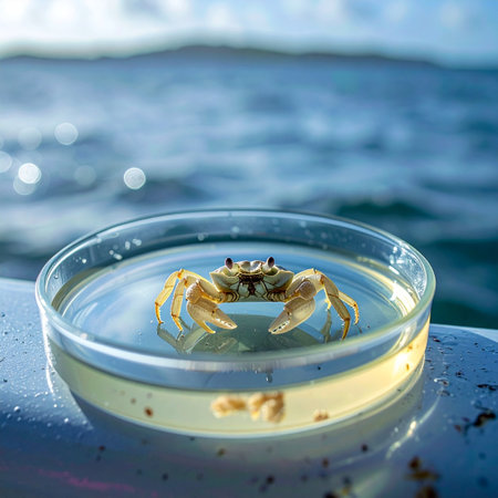 A close-up view of a crab on a rocky shoreline, surrounded by glistening water, showcasing the beauty of marine wildlife in a tranquil coastal environment.
