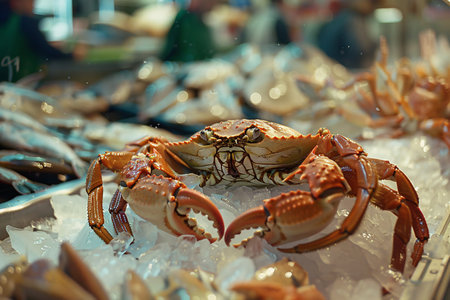 crab on ice in the fish market with copy space for text