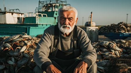 Fisherman sits on the seashore after a hard day. A tired fisherman reflects on a successful day by the sea.