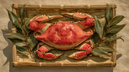 A close-up captures a cooked crab, its reddish shell contrasting with the bamboo tray. Green leaves provide a natural frame. The composition features overhead lighting, enhancing textures. This image could be used for culinary projects, restaurant menus, or food-related editorial content.