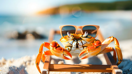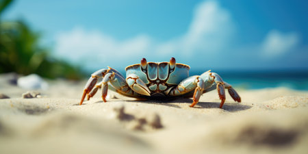 Close-up view of a crab on tropical sand beach. AI generated.
