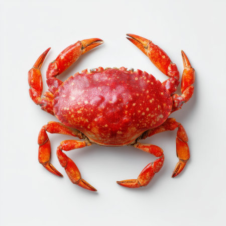 A stunning bright red crab rests elegantly on a clean white surface, showcasing its vibrant colors and unique texture, perfect for food and marine-themed projects.
